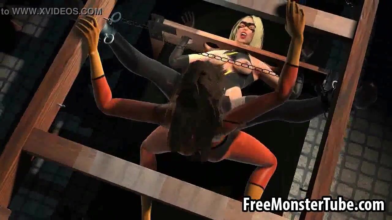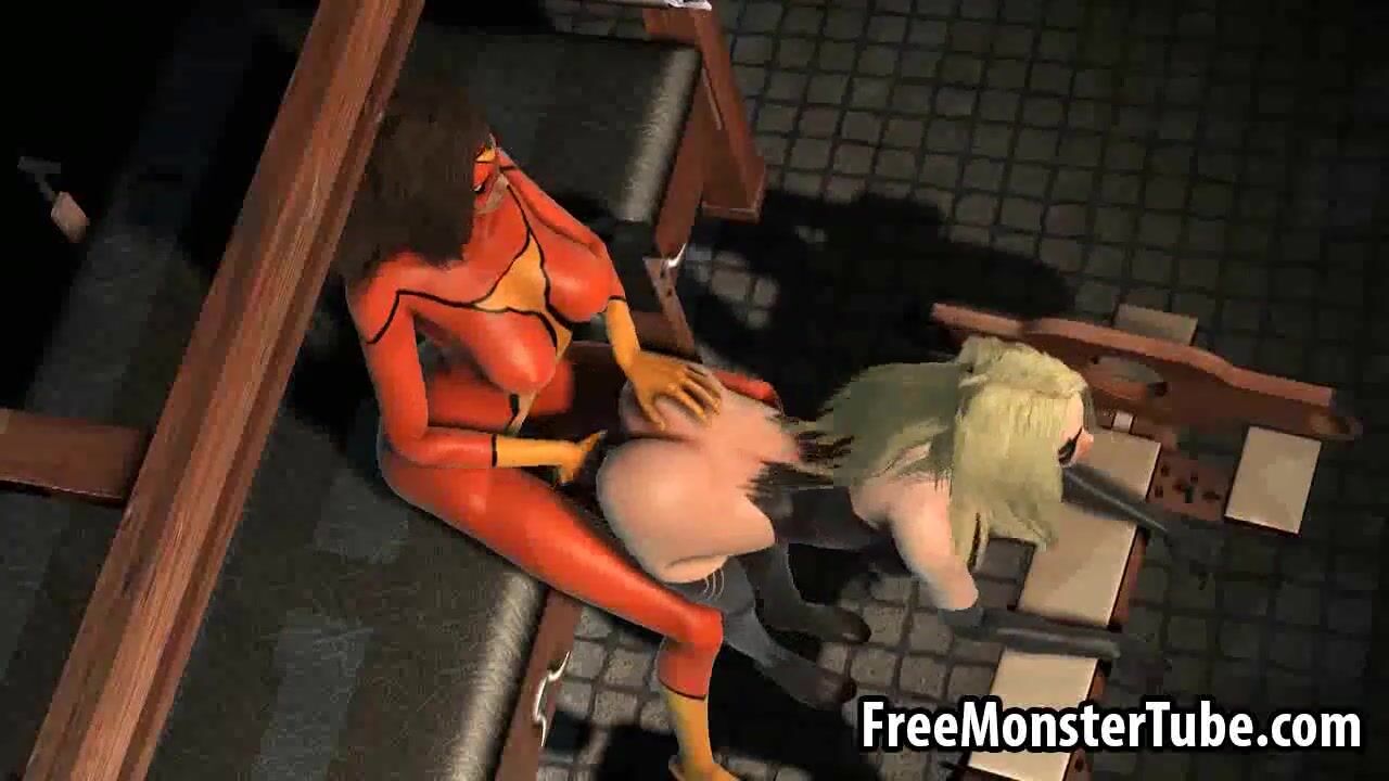 3D lesbian babe fucked with a strap on dildo