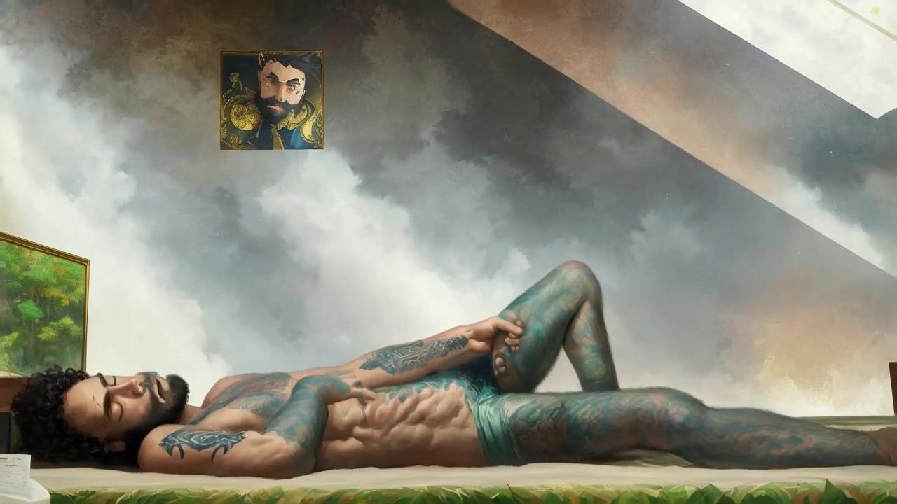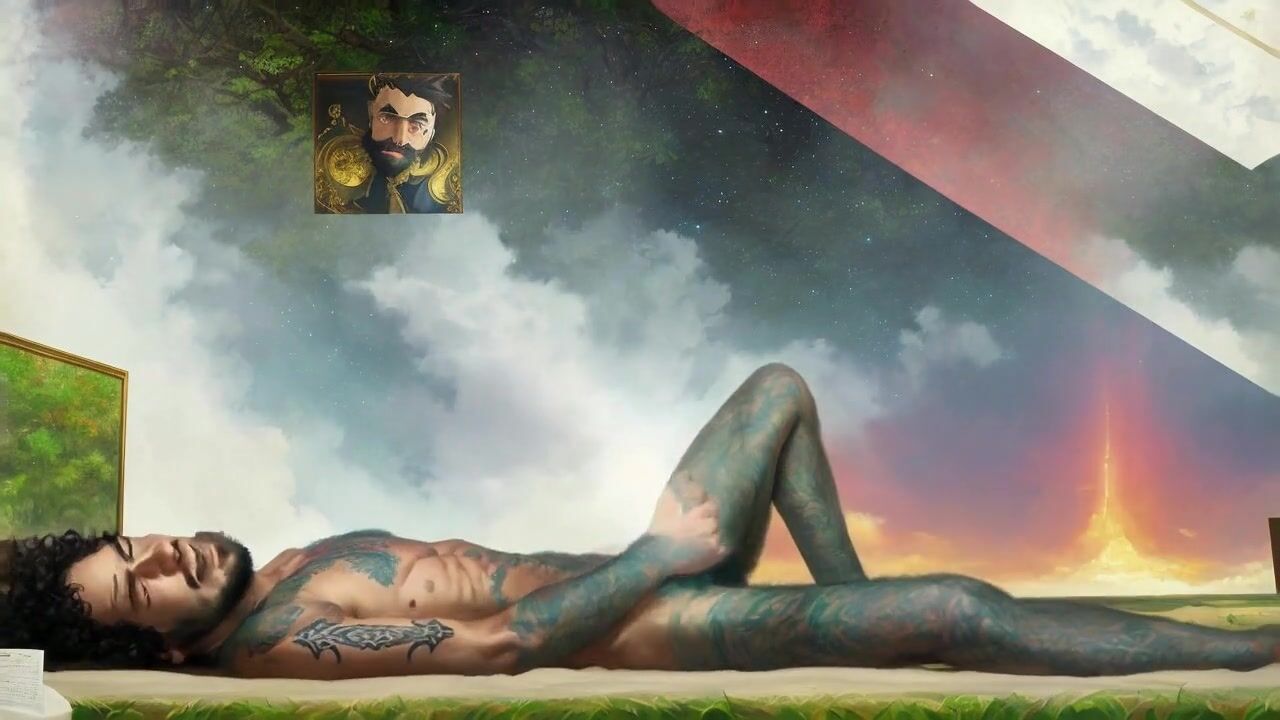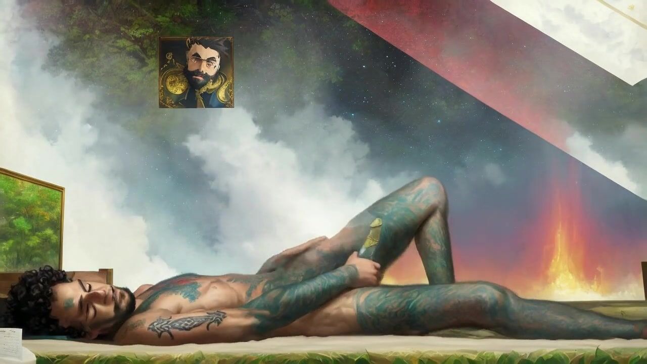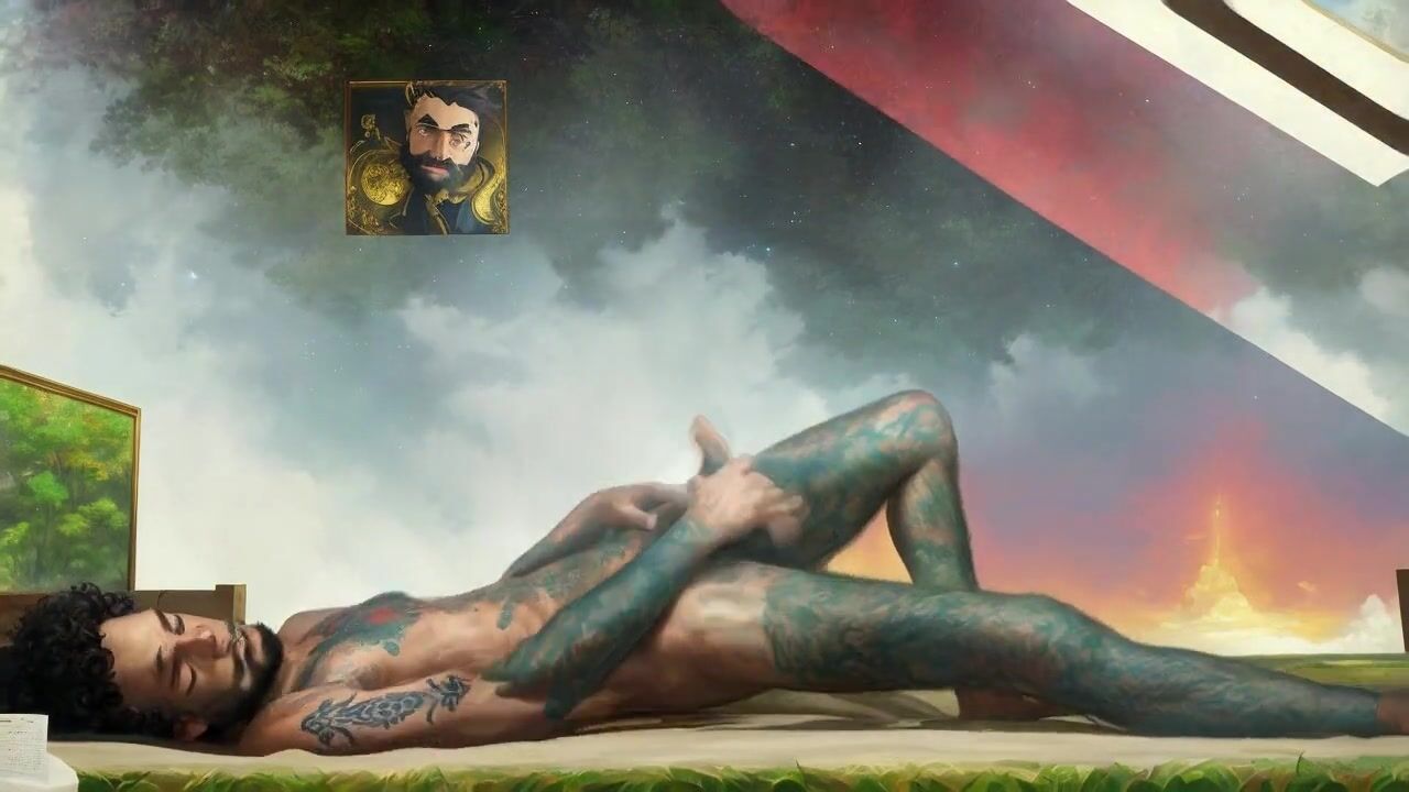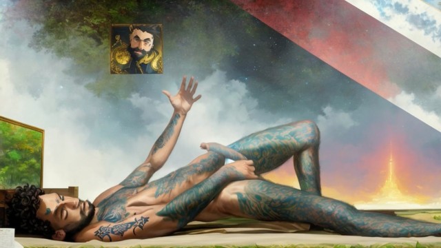 Tattooed hippie masturbating passionately in outer space *AI porn*